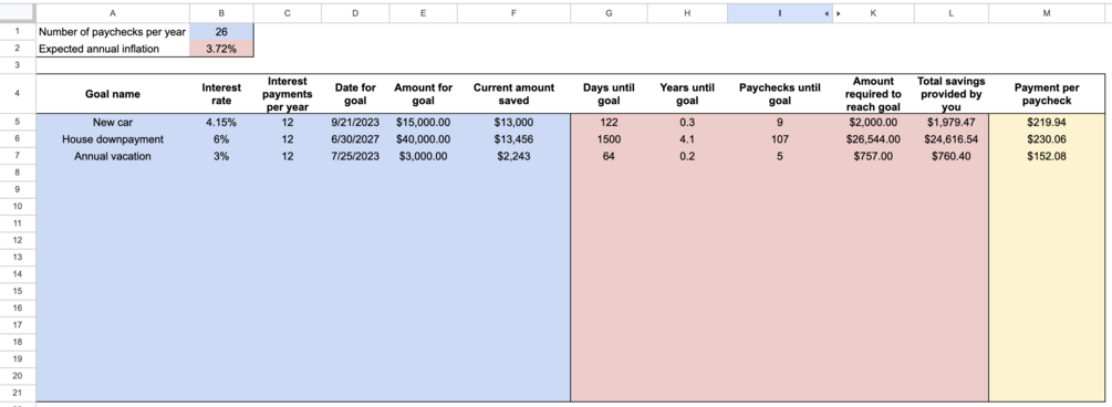 This spreadsheet helps to plan for future goals by determining how much needs to be saved each paycheck in order to reach your goal in the future. This spreadsheet accounts for inflation, and the per paycheck amounts are adjustable based on the number of paychecks you receive a year. All cells in blue are editable and all cells in red should remain unchanged. I will also be updating this over time, and I will email along new versions as they become available. If there are any issues, you can always reach out to me at alexwarfel@gmail.com.